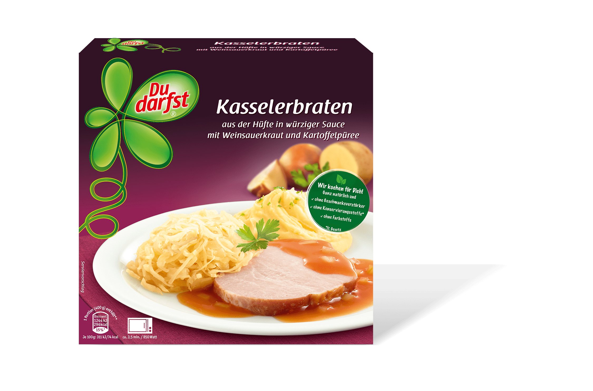 Weinsauerkrautzubereitung (28%) (Weinsauerkraut (18%)* (Weißkohl, Wein, Speisesalz), Wasser, Rapsöl, Zucker, modifizierte Stärke, Verdickungsmittel Guarkernmehl, Antioxidationsmittel Ascorbinsäure), Kartoffelpüree (24%) (Wasser, Kartoffeln, Rapsöl, Speisesalz, Emulgator Mono- und Diglyceride von Speisefettsäuren, Antioxidationsmittel (Natriummetabisulfit, Ascorbinsäure), Gewürze), Kasselerbraten aus der Hüfte (20%) (Schweinefleisch (19,4%)*, Wasser, Speisesalz, Stabilisator Natriumnitrit, Traubenzucker, Antioxidationsmittel Natriumisoascorbat, Rauch), Wasser, Senf (Wasser, Senfsaaten, Branntweinessig, Speisesalz, Gewürze), Tomatenmark, modifizierte Stärke, Zwiebeln, Sellerie, Speisesalz, Verdickungsmittel Guarkernmehl, Rapsöl, Sahne, Gewürze. *im Gesamtprodukt.