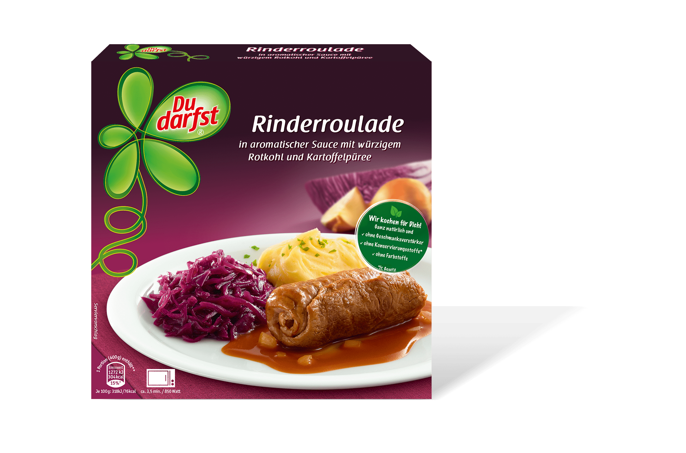 Rotkohlzubereitung (29%) (Rotkohl (22%)*, Wasser, Zucker, modifizierte Stärke, Speisesalz, Verdickungsmittel Guarkernmehl, Rapsöl, Antioxidationsmittel Ascorbinsäure, Gewürze, Branntweinessig, Apfelsaftkonzentrat, Johannisbeersaftkonzentrat), Kartoffelpüree (24%) (Wasser, Kartoffeln, Rapsöl, Speisesalz, Emulgator Mono- und Diglyceride von Speisefettsäuren, Antioxidationsmittel (Natriummetabisulfit, Ascorbinsäure), Gewürze), Rinderroulade (22,5%) (Rindfleisch (12,5%)*, Füllung (10%)* (Schweinefleisch (2,5%)*, Gewürzgurken (Gurken, Wasser, Branntweinessig, Speisesalz), Zwiebeln, Paniermehl (Weizenmehl, Wasser, Speisesalz, Hefe), Senf (Wasser, Senfsaaten, Speisesalz, Zucker, Branntweinessig, Gewürze), Wasser, Gewürze, Speisesalz, Kartoffelstärke)), Wasser, Senf (Wasser, Senfsaaten, Branntweinessig, Speisesalz, Gewürze), Tomatenmark, modifizierte Stärke, Gurken, Zucker, Sellerie, Gewürze, Speisesalz, Verdickungsmittel Guarkernmehl, karamellisierter Zucker, Branntweinessig, Rapsöl, Sahne, Sambal Oelek (Chili, Paprika, Wasser, Speisesalz). *im Gesamtprodukt.Das Produkt kann Spuren von Ei, Soja, Erdnüssen, Schalenfrüchten und Fisch enthalten.