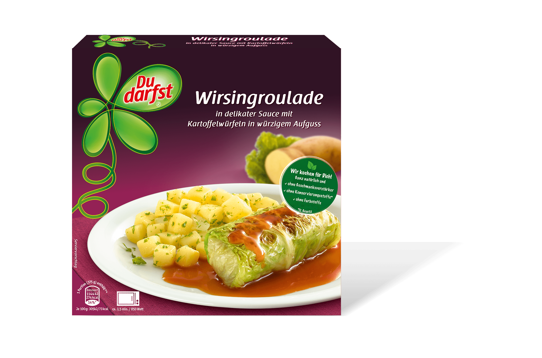 Mit der Du darfst Wirsingroulade fällt Ihnen der Genuss von deftiger Hausmannskost sicher leicht. Mageres Rind- und Schweinefleisch in feinem Wirsing und mit Petersilie und Zwiebeln verfeinert, pikante Bratensauce und goldgelbe, bissfeste Kartoffeln machen dieses Menü zu einem herzhaften Genuss. Einfach im Wasserbad oder in der Mikrowelle zubereiten und losschlemmen.