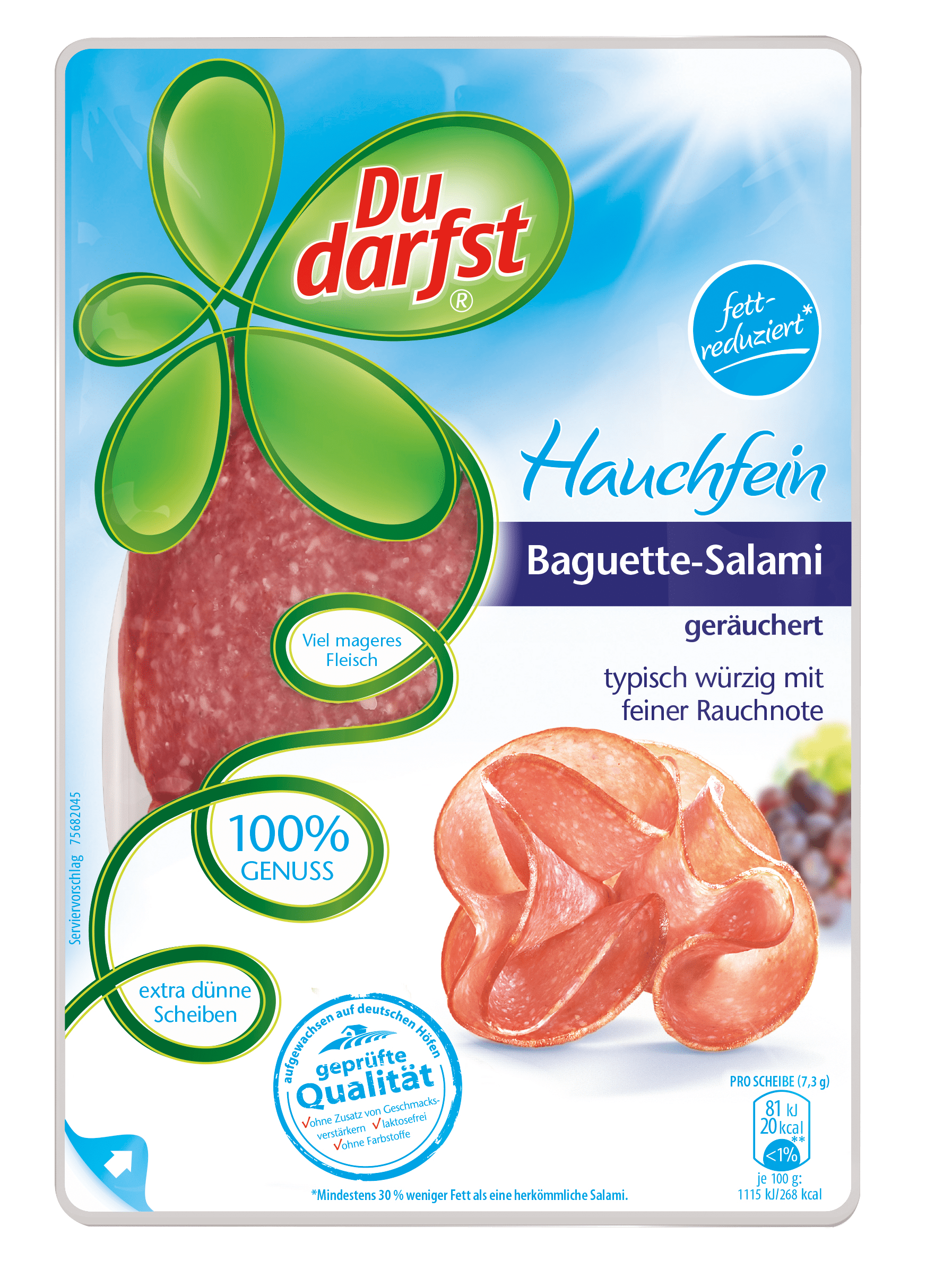 Wir lieben die hauchfeine Baguette Salami von Du darfst. Dem mild-würzigen Geschmack der extra dünnen Scheiben aus bestem Schweine- und Rindfleisch werden Sie nur zu gern nachgeben. Enthält 30% weniger Fett als herkömmliche Salami durch den Einsatz von mehr magerem Fleisch.