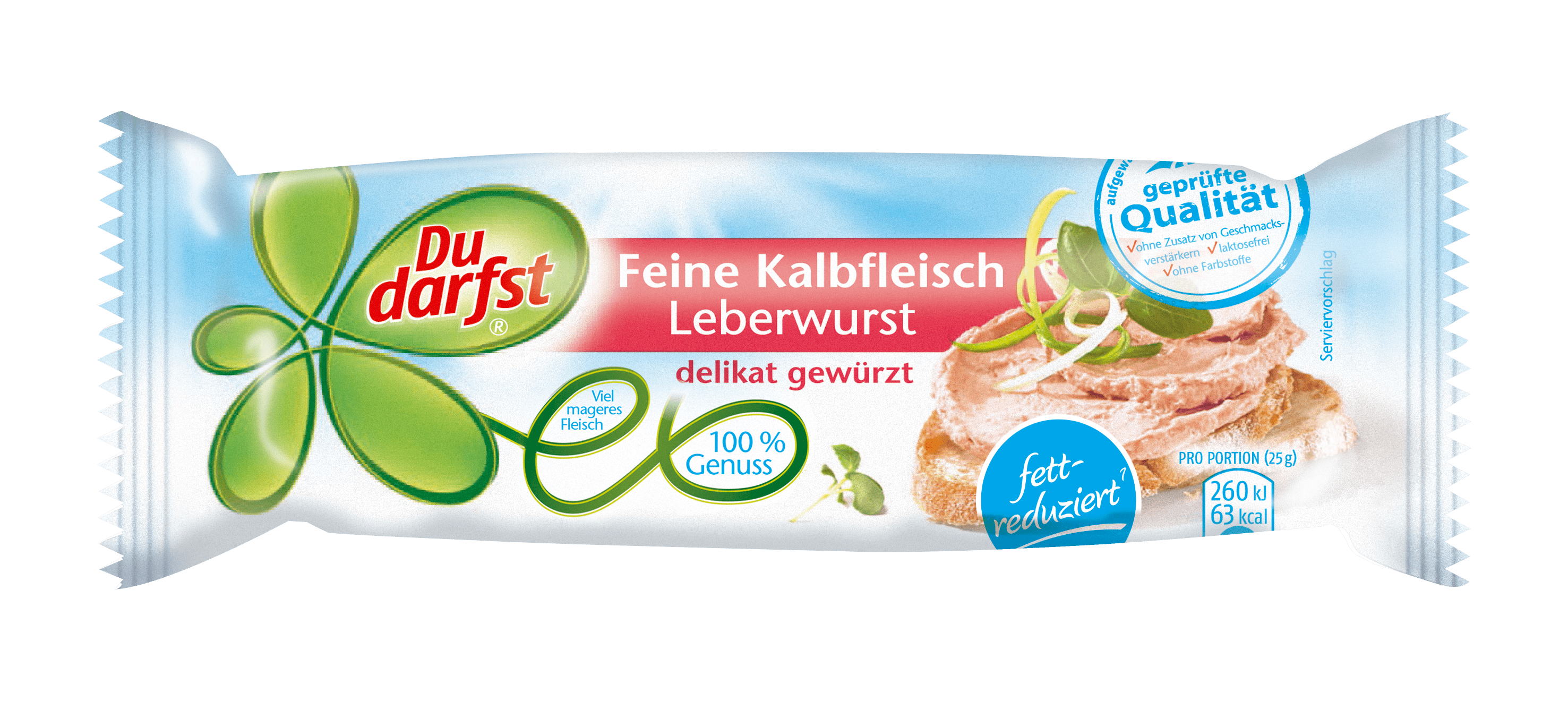 Wurstgenuss, der deine Brotzeit zur besten Zeit des Tages werden lässt: Die Feine Kalbsfleischleberwurst von Du darfst ist besonders delikat gewürzt, besticht durch höchste Qualität und überzeugt mit 20% Fett.