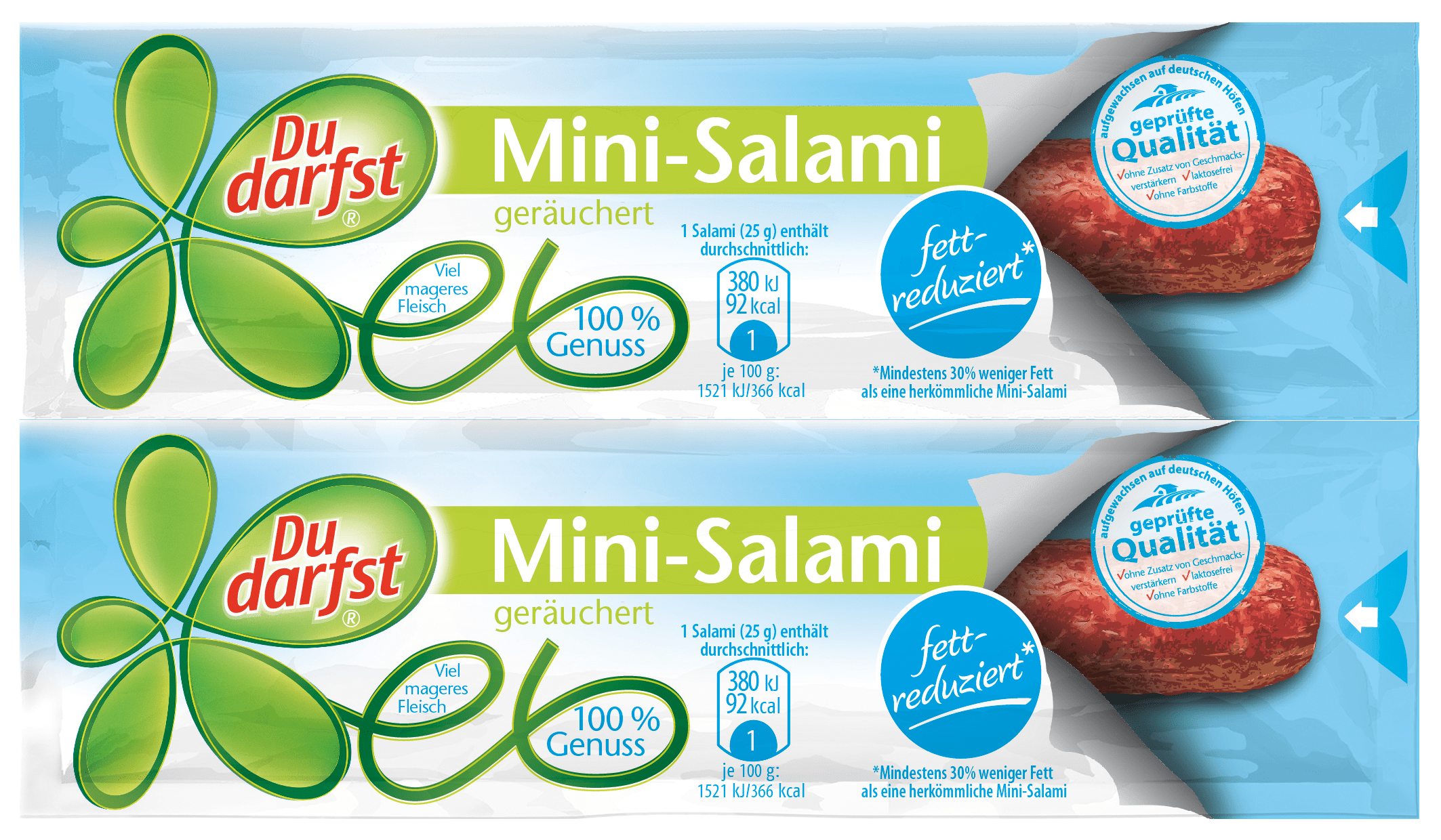 Der beliebte Snack-Klassiker von Du darfst - als leichte Variante mild geräuchert und herzhaftwürzig im Geschmack. Enthält weniger Fett als herkömmliche Salami durch den Einsatz von mehr magerem Fleisch. Für dieses Du darfst Produkt wurde ausschließlich Fleisch von Tieren, die auf deutschen Höfen aufgewachsen sind, verwendet.